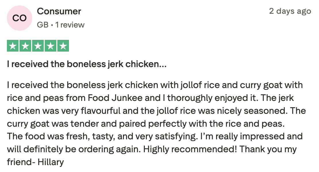 "I love discovering new restaurants, and FoodJunkee makes it so easy. The quality standards are high, and every order has been absolutely delicious. Highly recommended!"
